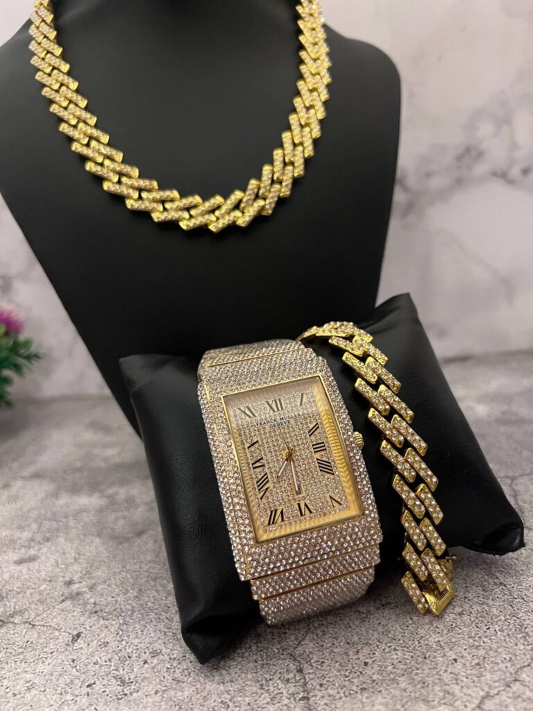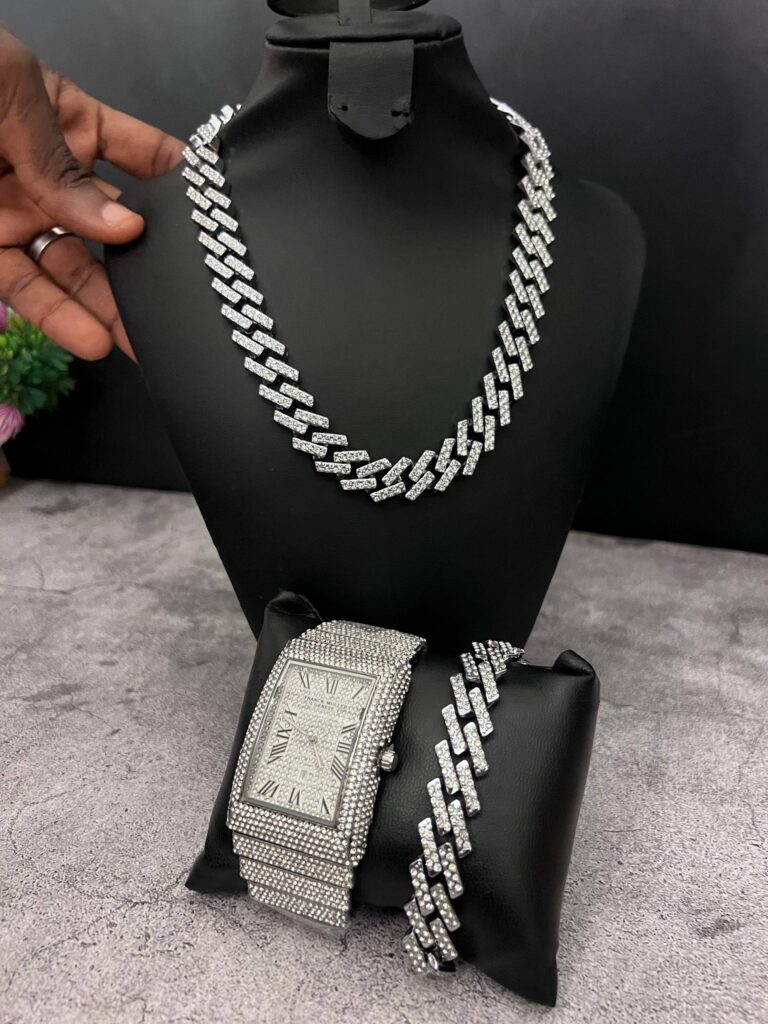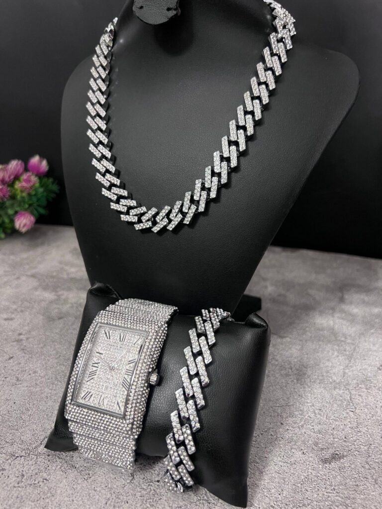 This jewelry set — the bold chain, sleek bracelet, and luxury wristwatch — gives you that instant respect and admiration anywhere you show up.